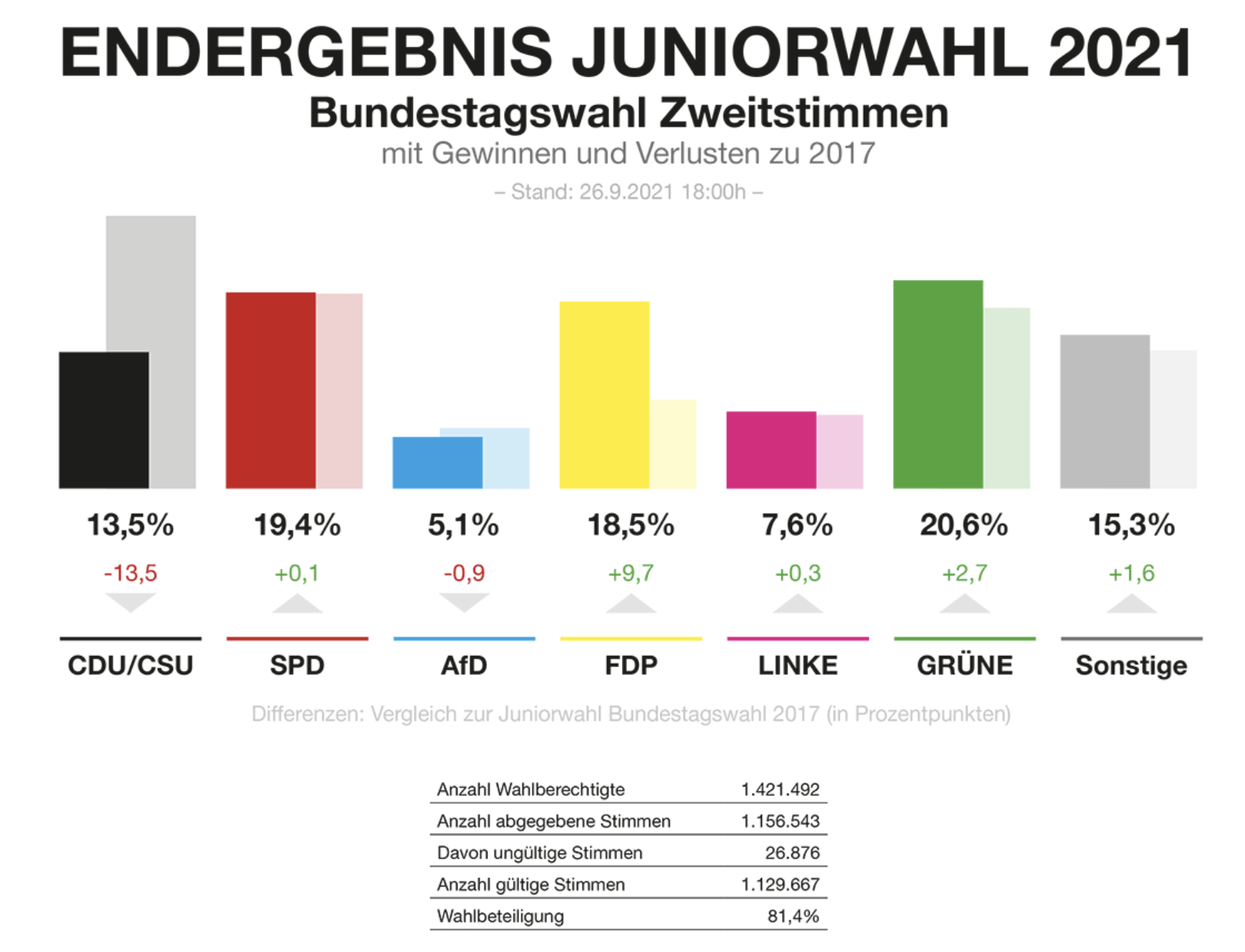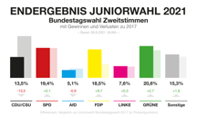 Am Wahlsonntag war es dann soweit: Zeitgleich mit den Wahlergebnissen der Bundestagswahl am 26.09.2021 wurden auch die Ergebnisse der Junior-Bundestagswahl um 18 Uhr veröffentlicht.